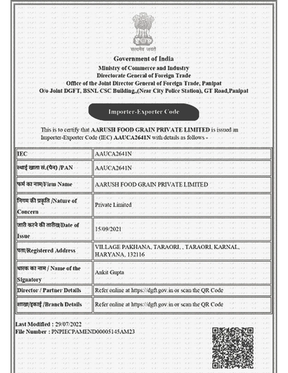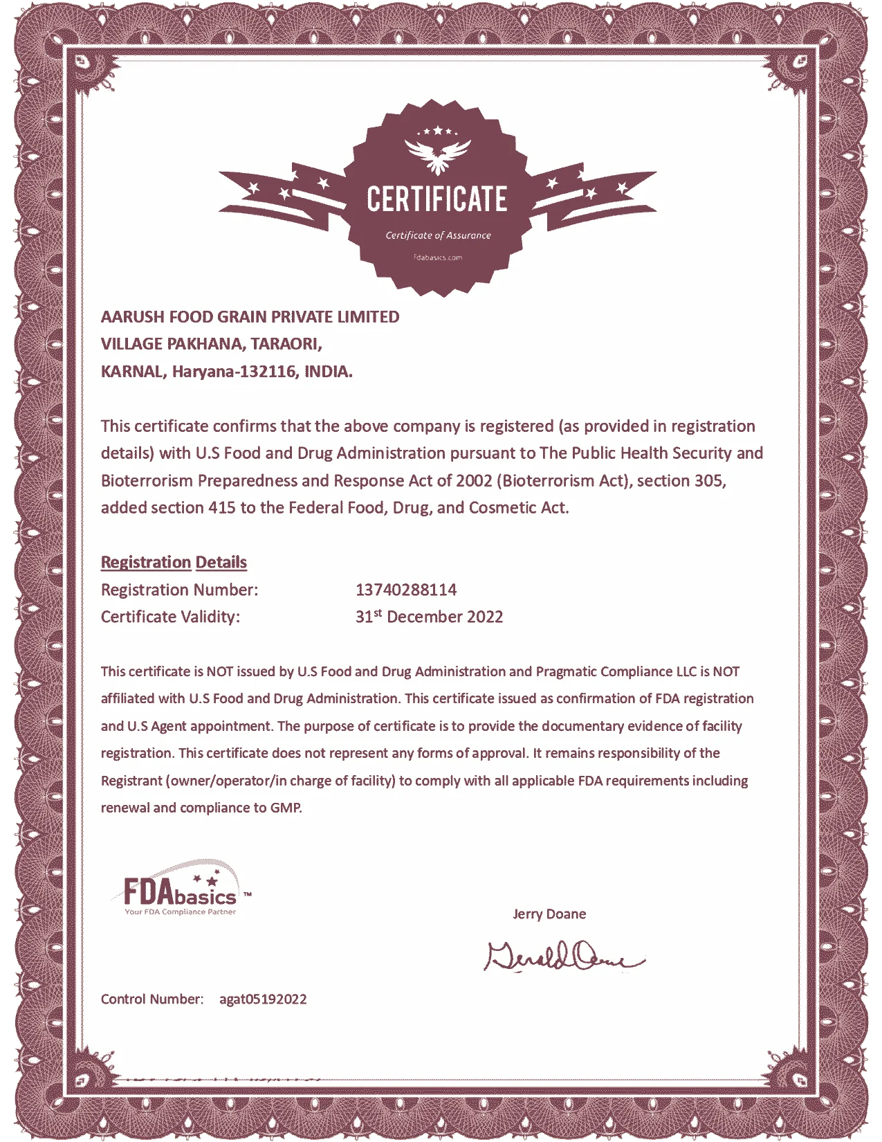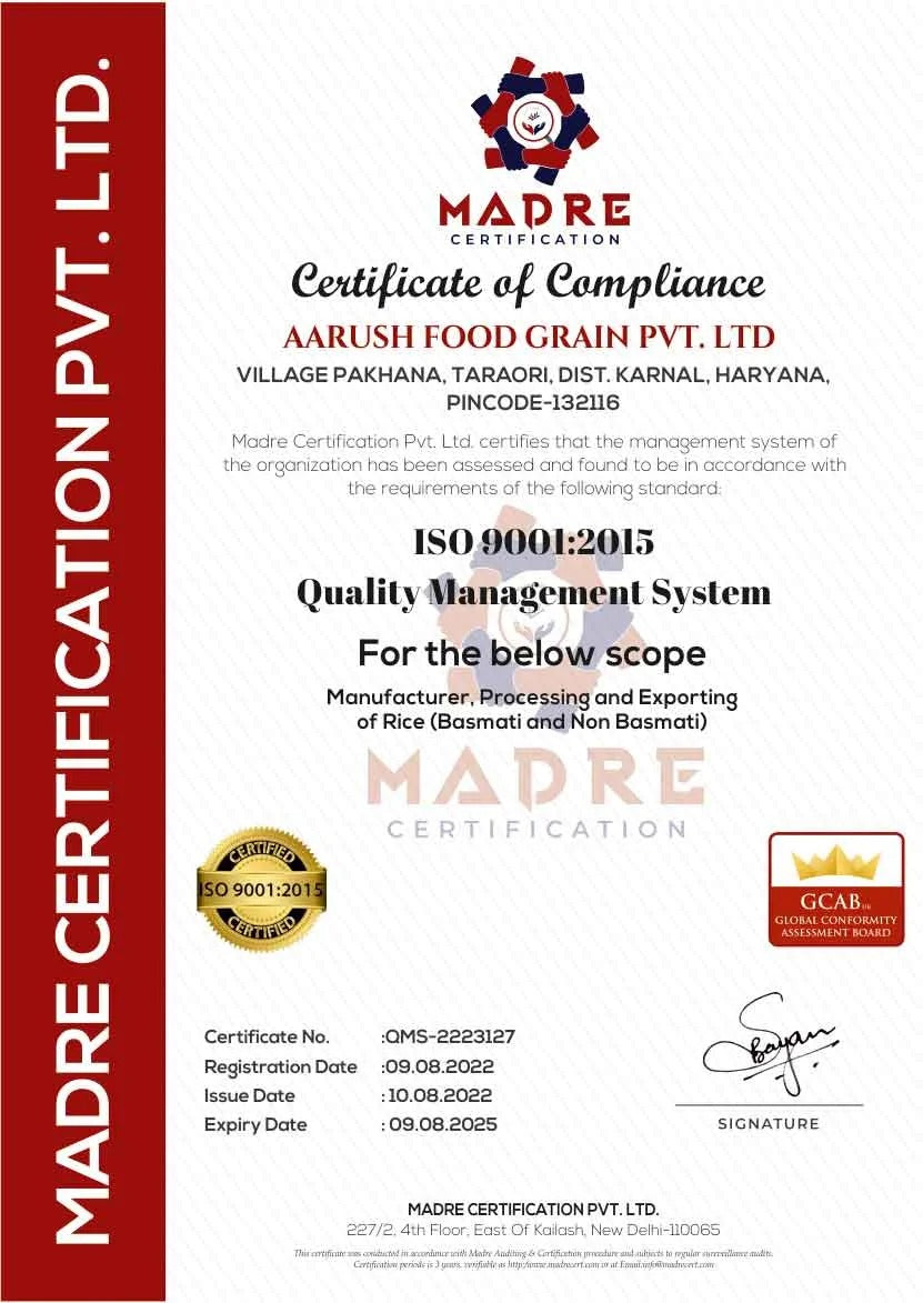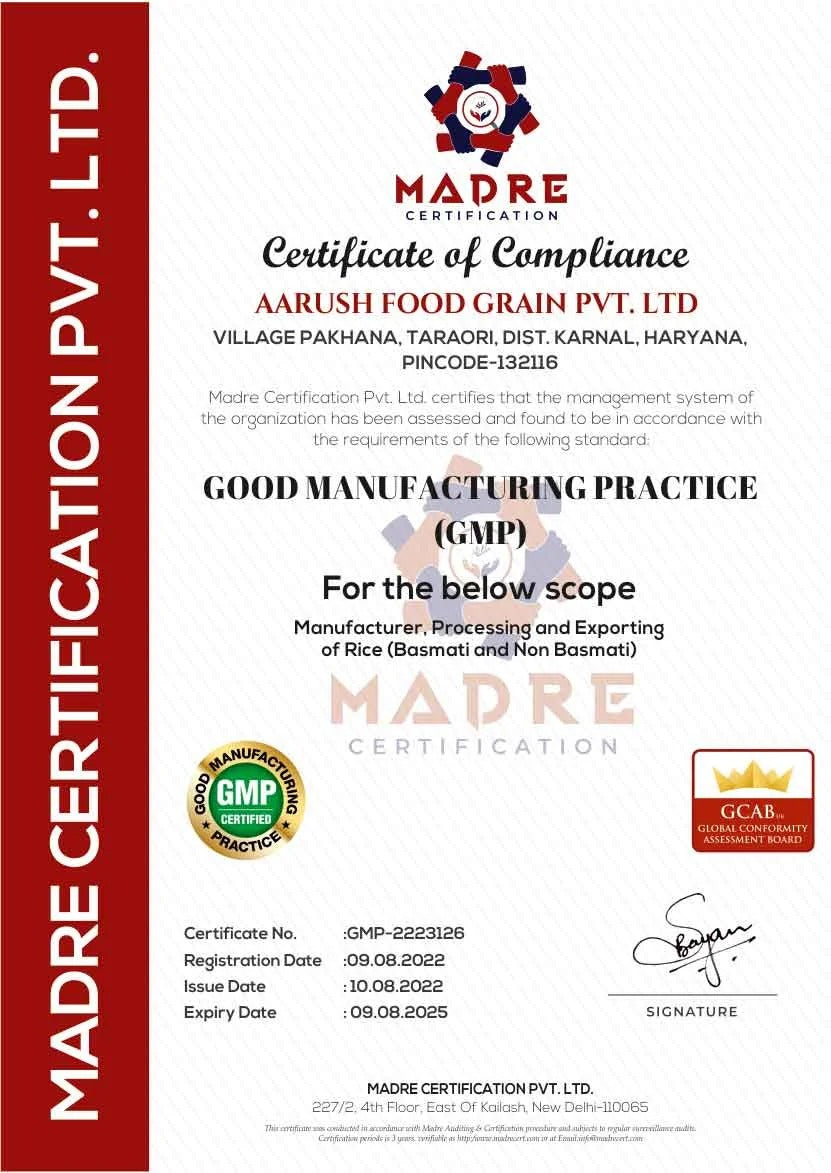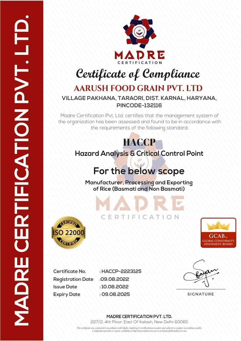 We hold prestigious certificates including ISO 22000:2018 for food safety, HACCP for critical control points, HALAL and KOSHER compliance, GMP standards, FSSAI registration, and USFDA approval. These validate our premium basmati and non-basmati rice processing at Taraori, Haryana.